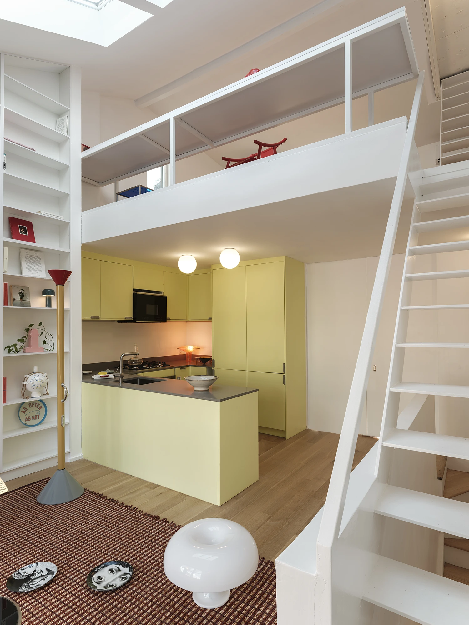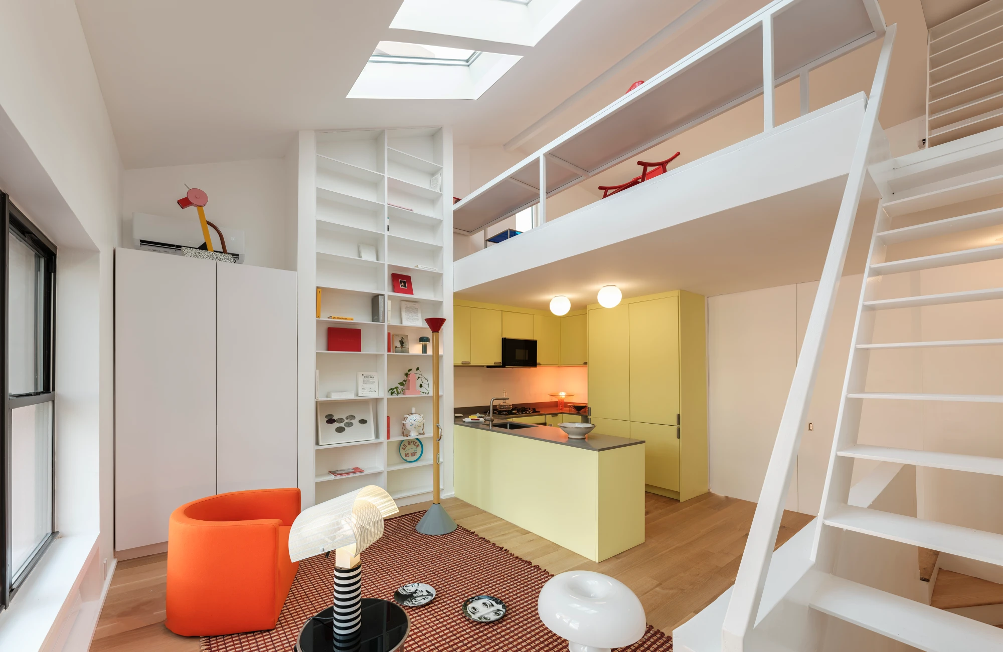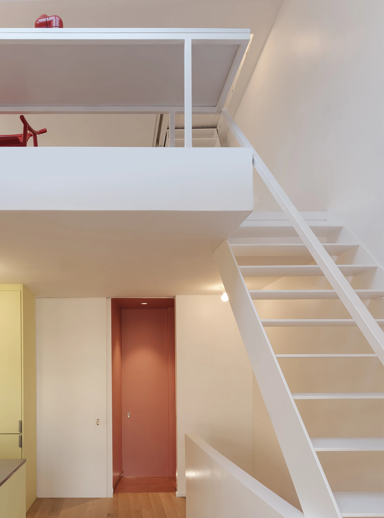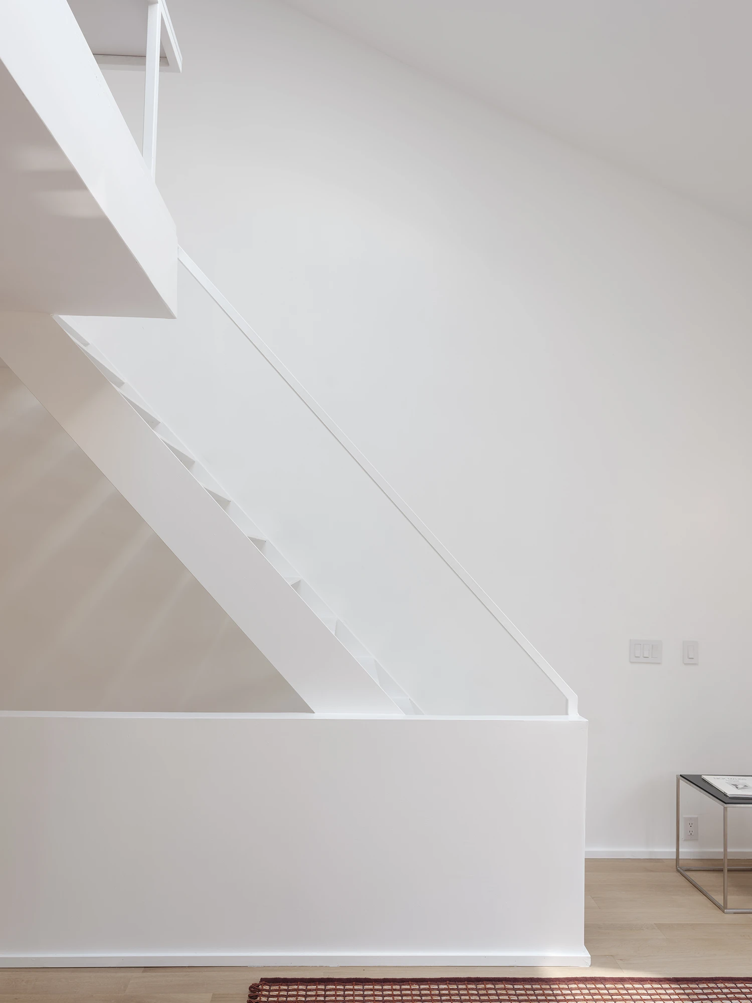 The low-ceilinged attic space was converted into a work loft and connected to the living area below with a built-in bi-level bookcase and desktop overlook. Skylights and relocated windows bring in ample light and create multi-directional views, adding dimension and space to the former conventional layout. The renovation includes an "infinity staircase" that acts as a sculptural centerpiece and enhances verticality, while double doors to bed and bathroom increase the feeling of spaciousness. The bedroom features floor-to-ceiling closets and a functional wall with built-in cabinets, maximizing the use of every inch of the apartment for maximum utility, space, and light.