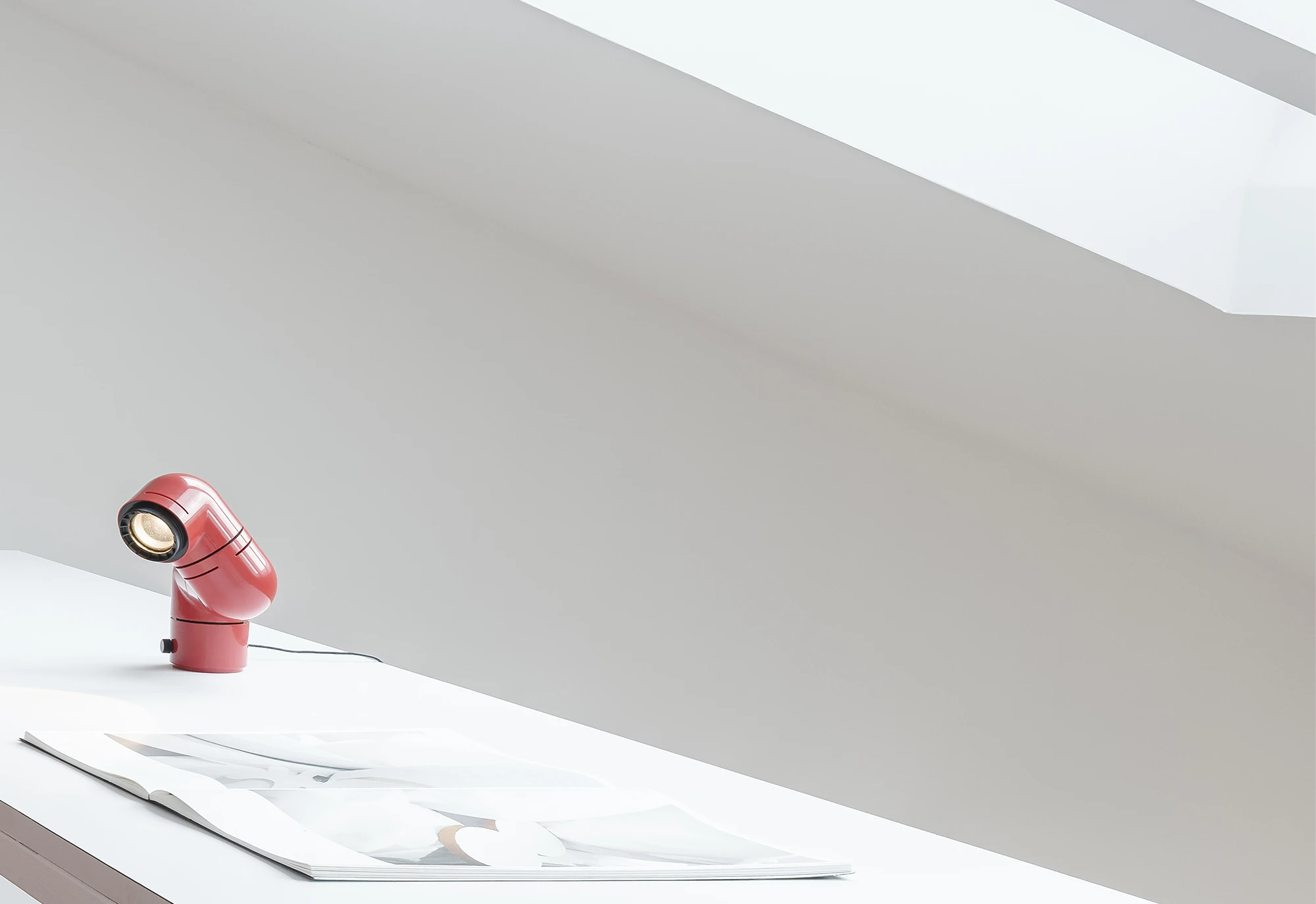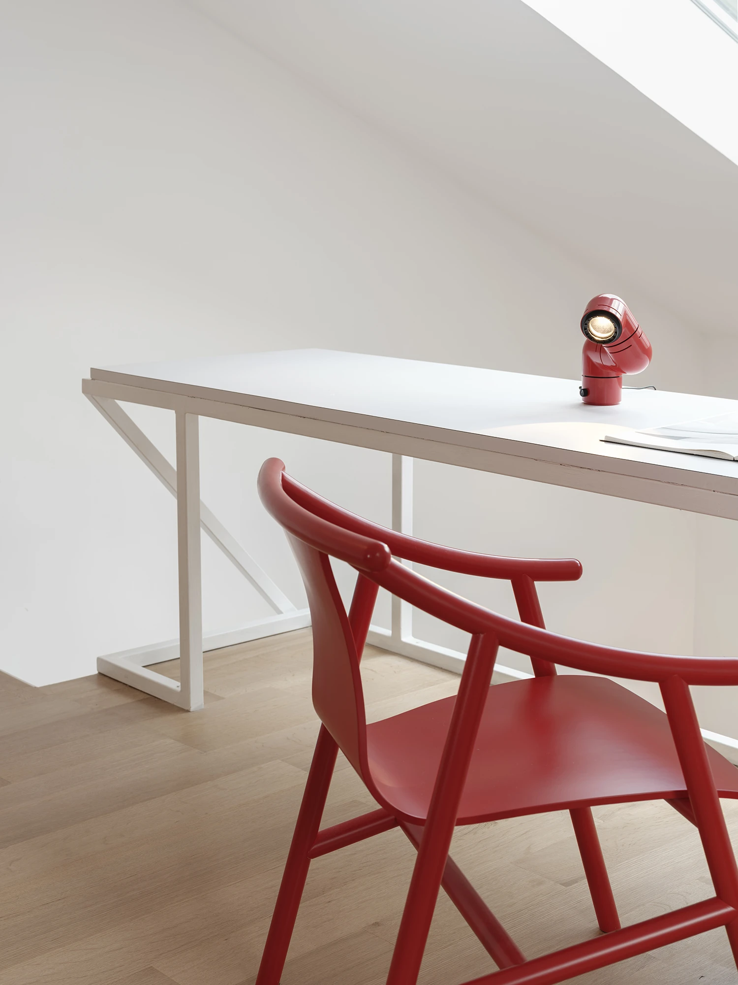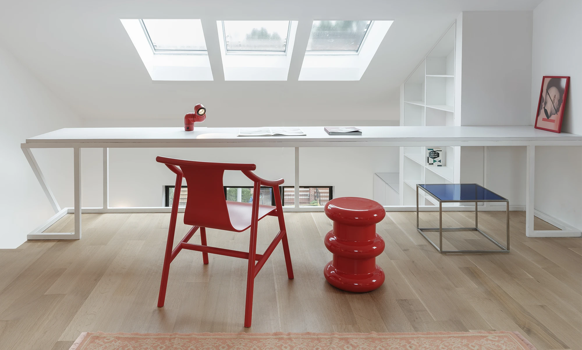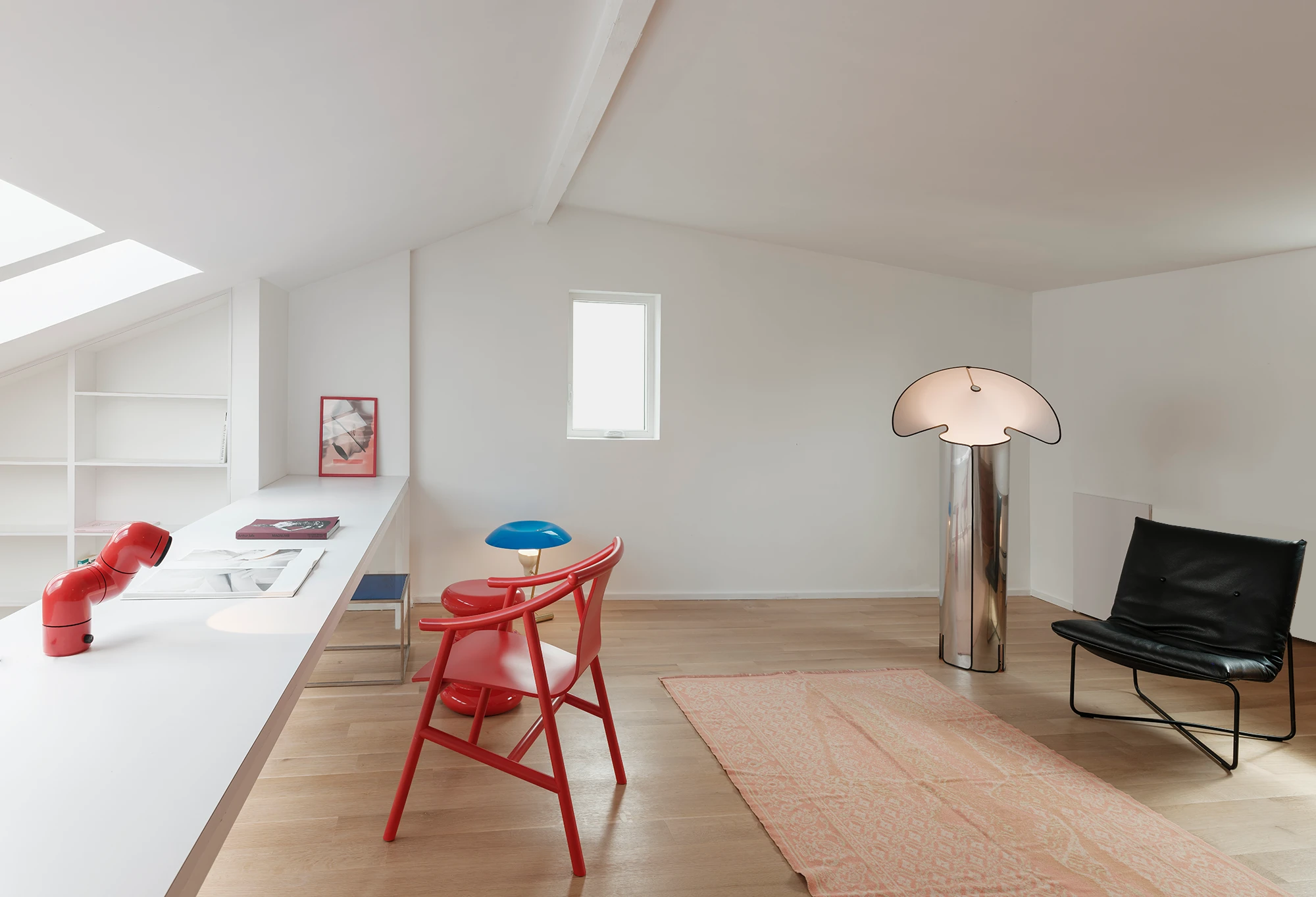 The low-ceilinged attic space was converted into a work loft and connected to the living area below with a built-in bi-level bookcase and desktop overlook. Skylights and relocated windows bring in ample light and create multi-directional views, adding dimension and space to the former conventional layout. The renovation includes an "infinity staircase" that acts as a sculptural centerpiece and enhances verticality, while double doors to bed and bathroom increase the feeling of spaciousness. The bedroom features floor-to-ceiling closets and a functional wall with built-in cabinets, maximizing the use of every inch of the apartment for maximum utility, space, and light.