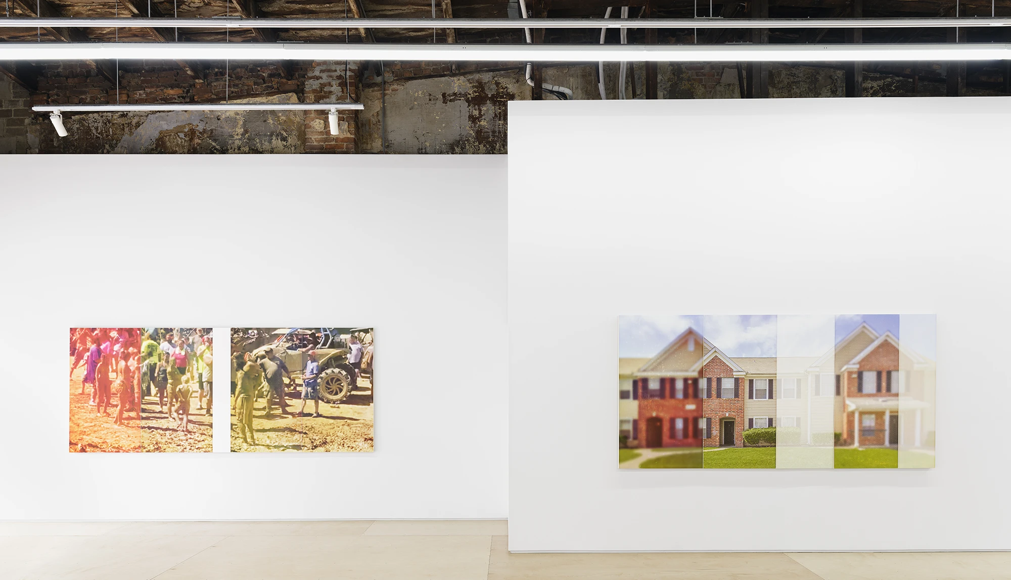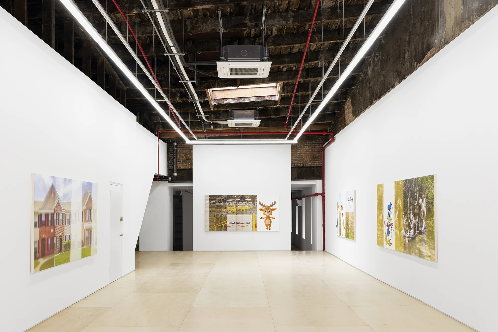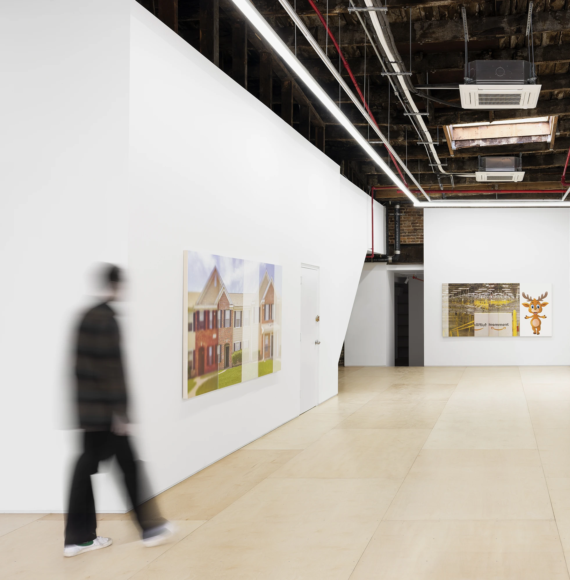 The gallery preserved the original wooden ceiling above the perimeter curtain walls for art display and the lighting design features suspended fixtures that float in space, framing the upper void with a continuous structural line. To provide maximal flexibility for exhibition configurations, additional parallel lighting tracks were installed on the ceiling. The gallery space extends toward the back with additional rooms featuring lower ceilings and natural light that filters in from double hung windows.