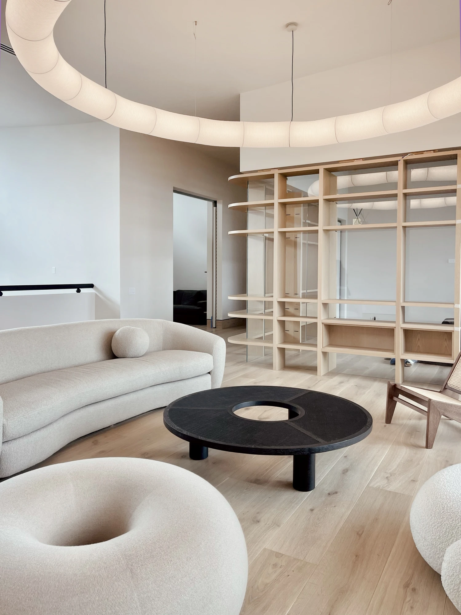 The lighting design is integrated within the architectural surfaces to preserve the purity of the interior geometry while revealing its depth and texture. Accent lighting defines the curvature of the furniture and the interior skin, enhancing the perception of space and movement as daylight shifts across the day.