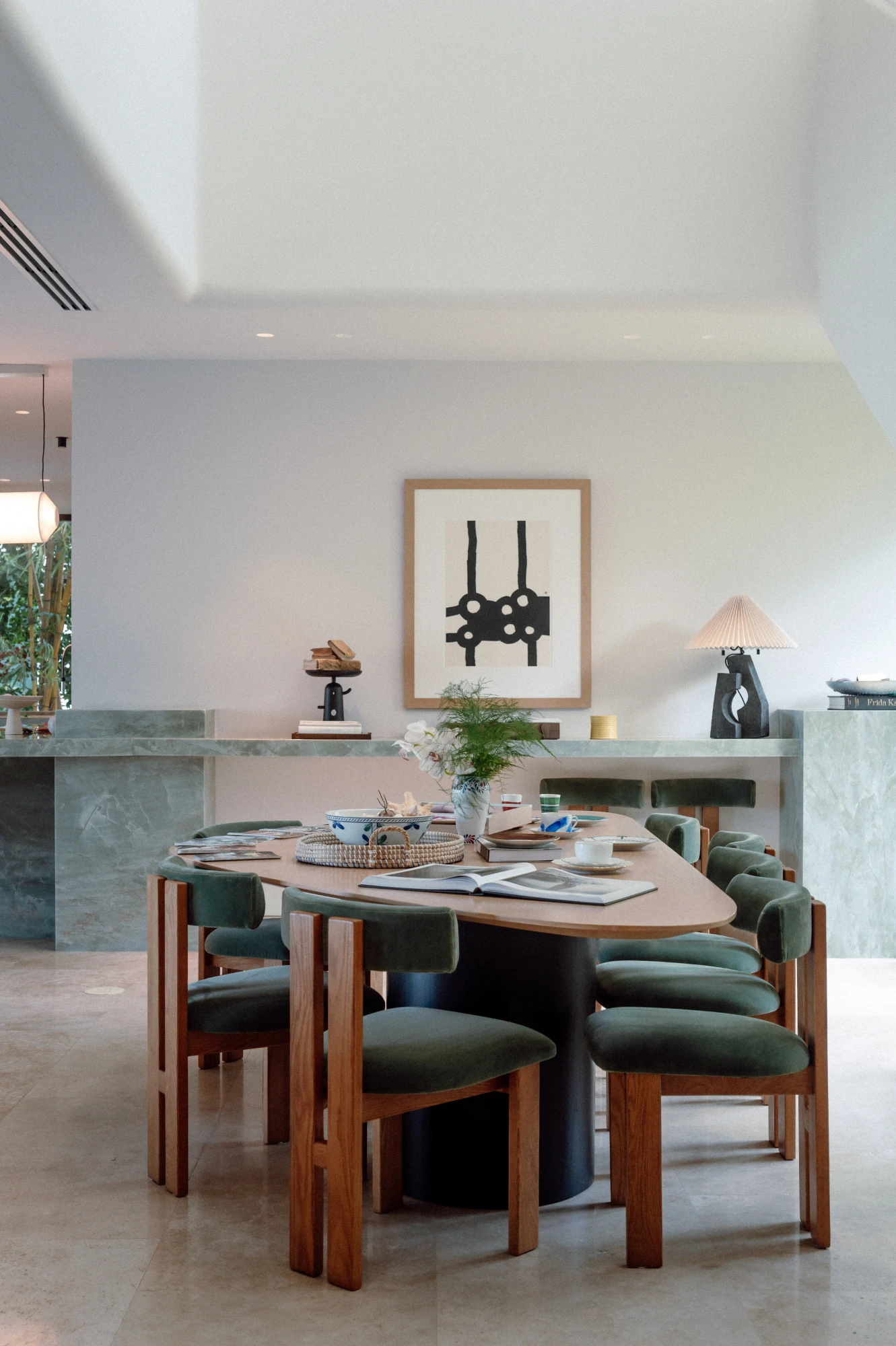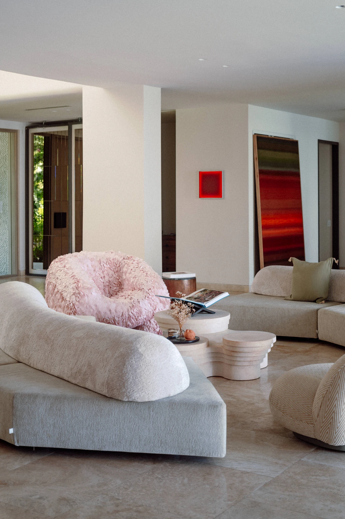 A warm palette of diffusers was selected for the decorative pendants, contributing to a sense of balance between natural and artificial light. The Tekio lamp, used in various locations and scales, establishes a visual rhythm throughout the home, adapting to the proportions of each living and dining area while maintaining a cohesive material and atmospheric identity. The result is a layered composition of light that reinforces the architecture’s softness and its constant dialogue with the surrounding sea and sky.